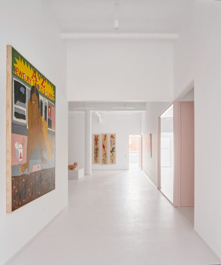 A system of square glass partitions, outlined in pink, extends across the interior as both structure and device. These frames do not simply divide space. They construct a sequence of visual fields through which both art and life are continuously composed.
