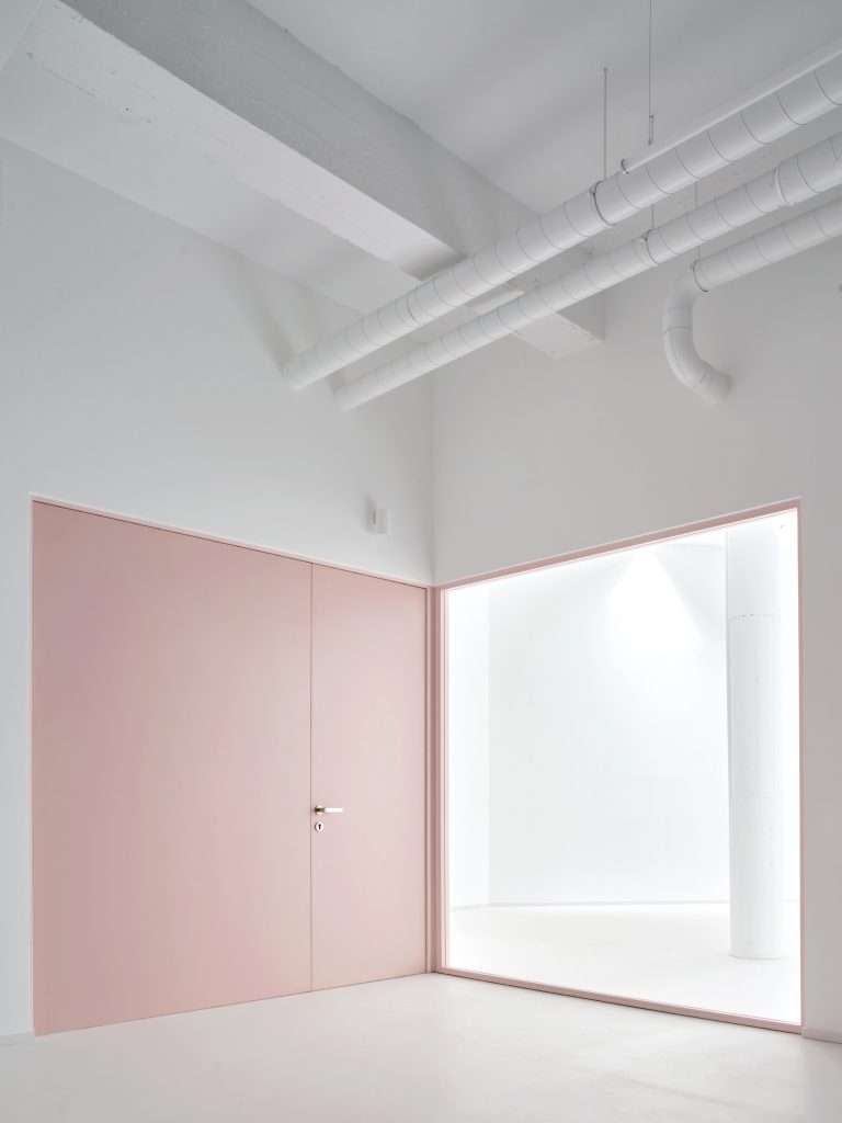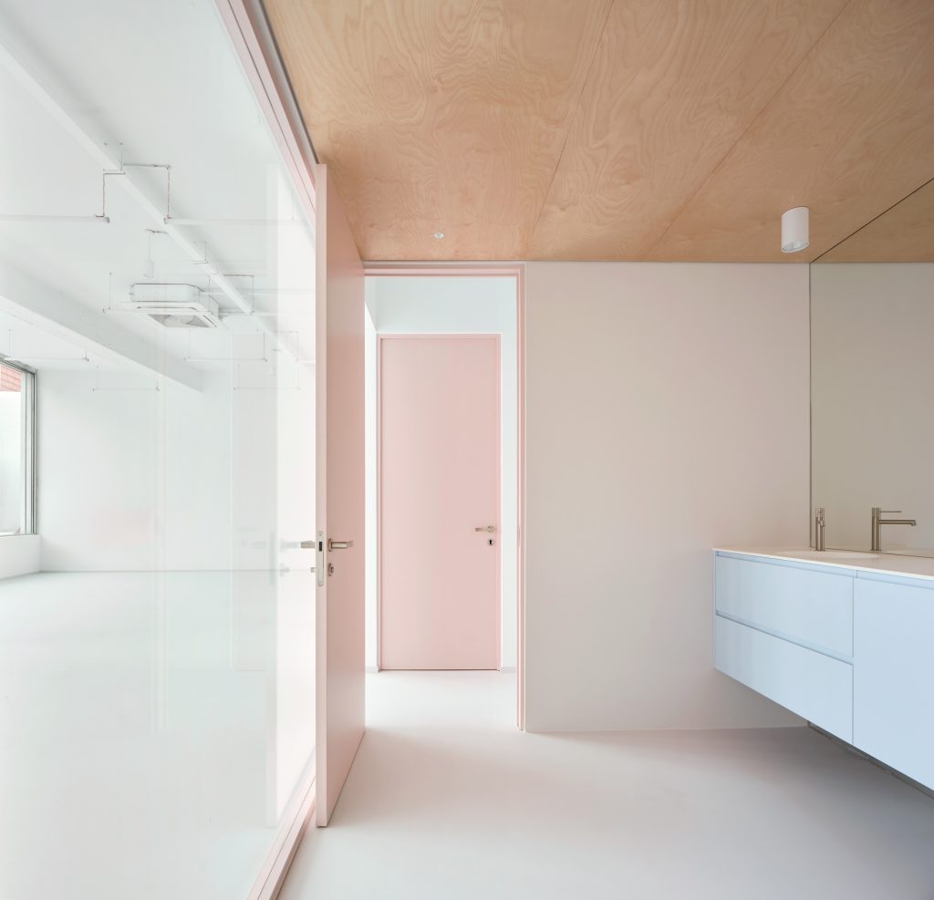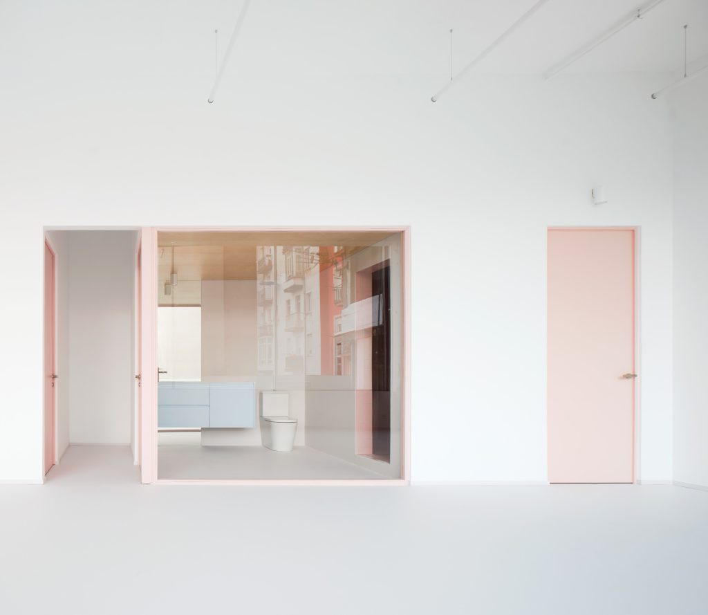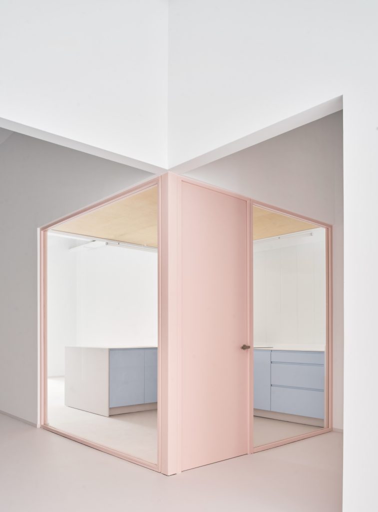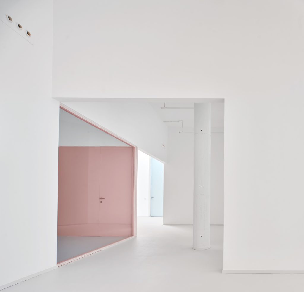 The interior is defined by a controlled material palette that operates less as expression than as modulation. White surfaces establish a field of neutrality, amplifying light and reducing distraction. Grey flooring introduces weight and continuity underfoot. Pink frames trace a graphic rhythm across the space, while light blue furnishings register as soft interruptions within an otherwise restrained composition.