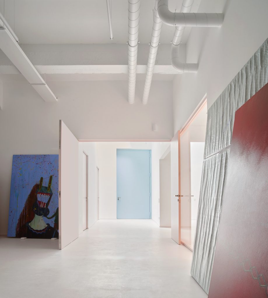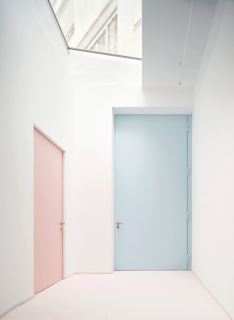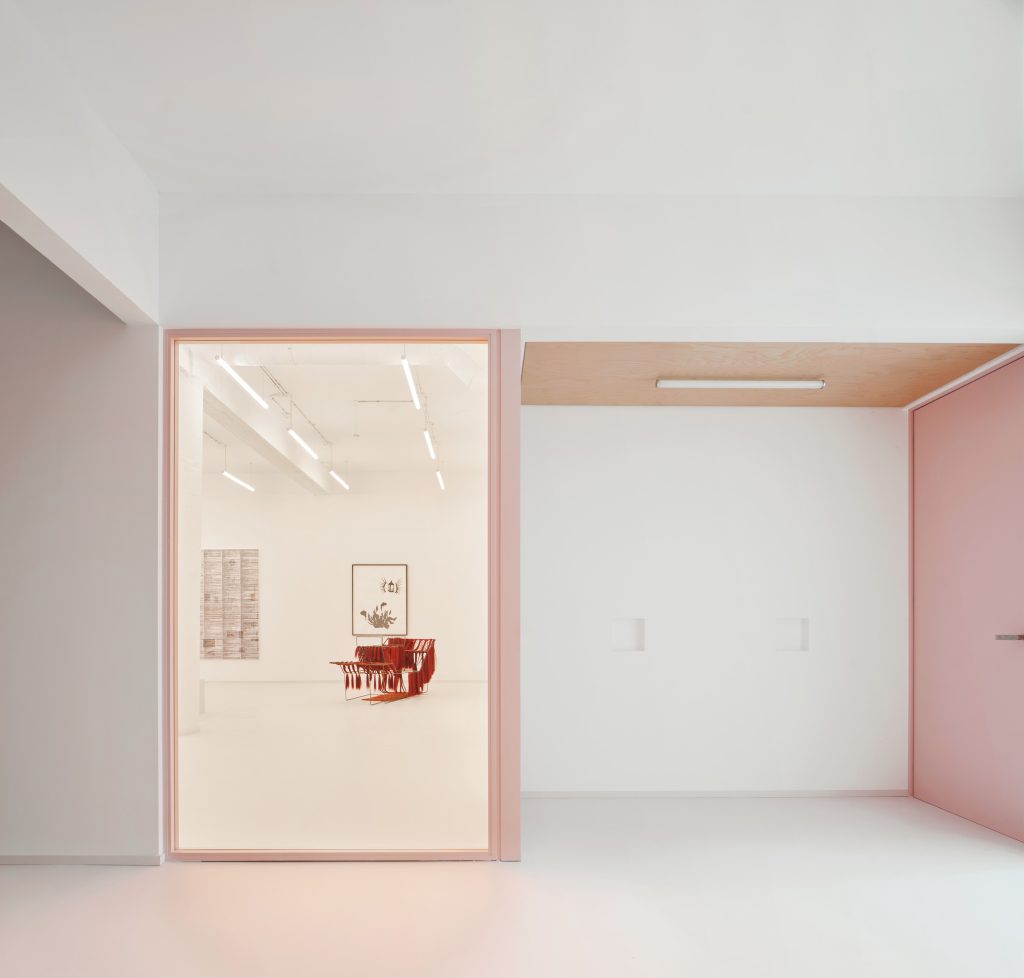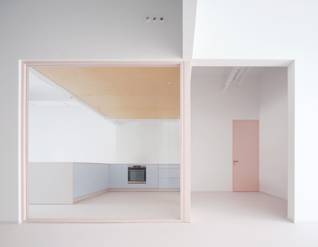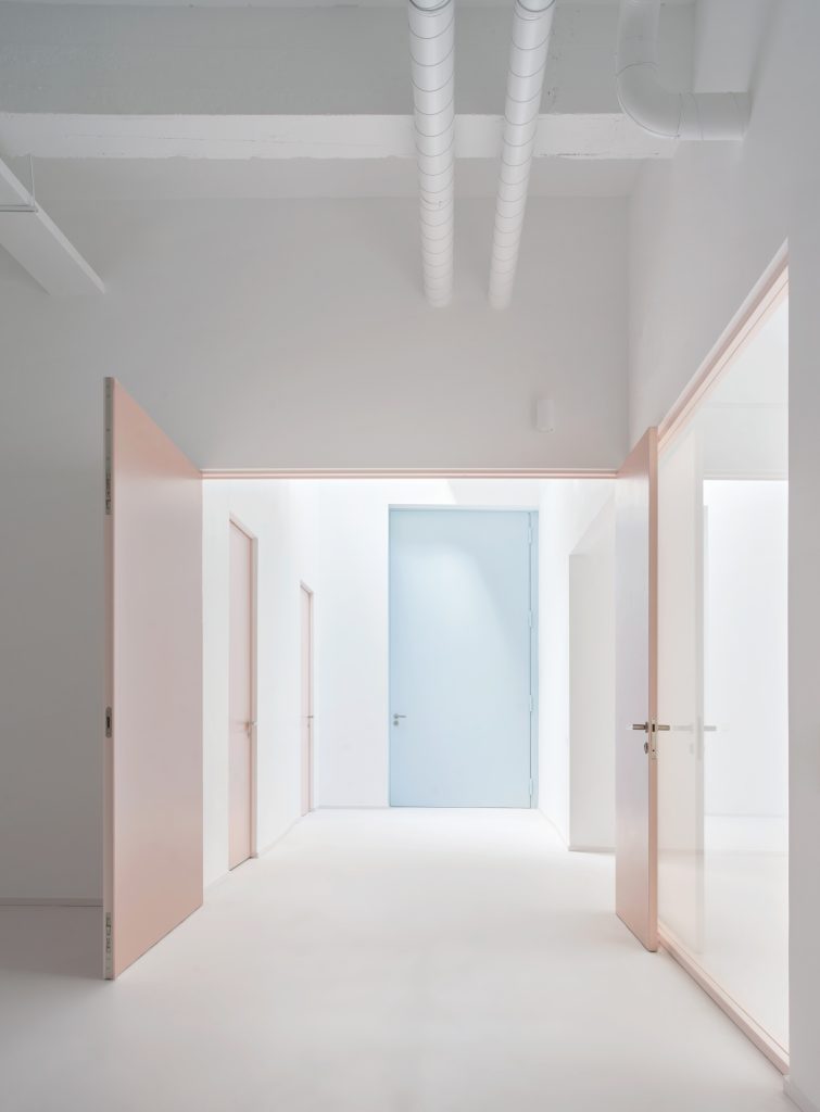 The interior is defined by a controlled material palette that operates less as expression than as modulation. White surfaces establish a field of neutrality, amplifying light and reducing distraction. Grey flooring introduces weight and continuity underfoot. Pink frames trace a graphic rhythm across the space, while light blue furnishings register as soft interruptions within an otherwise restrained composition.