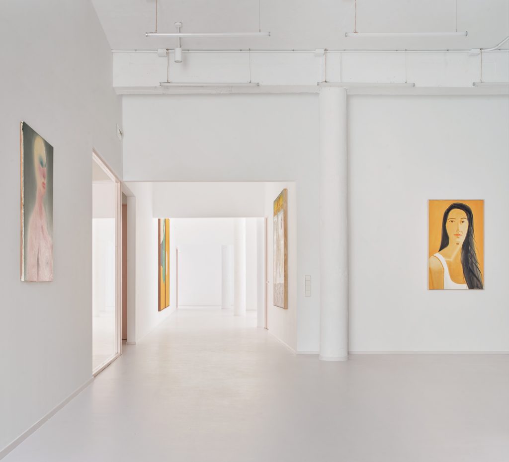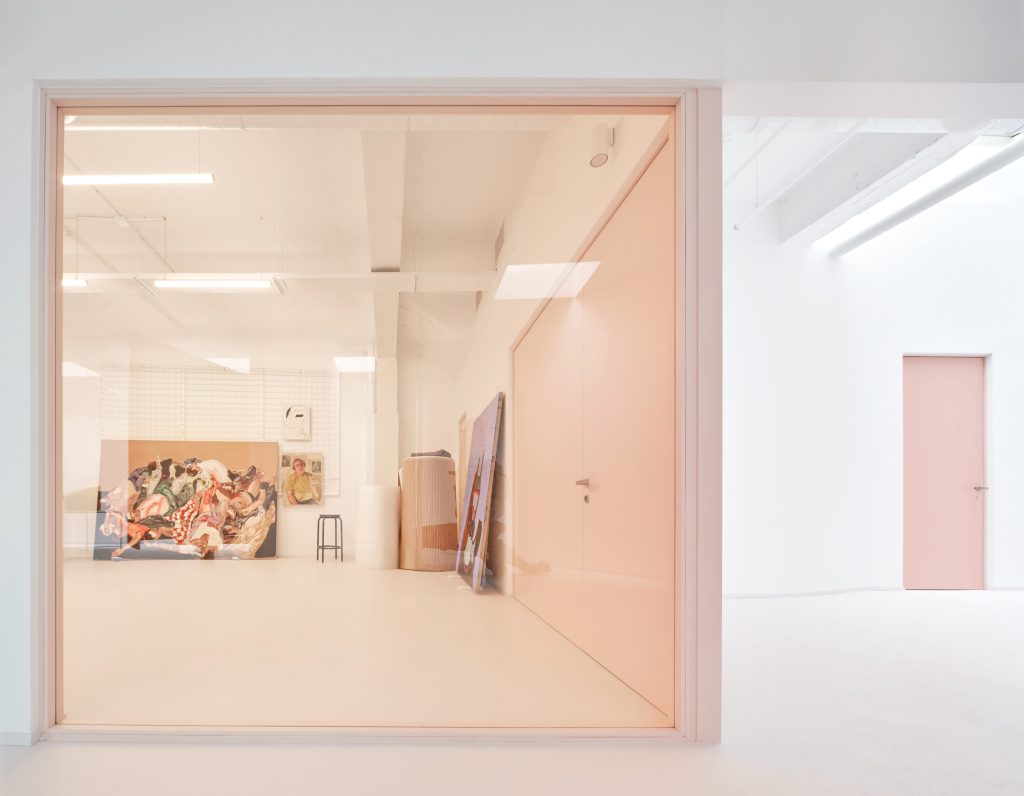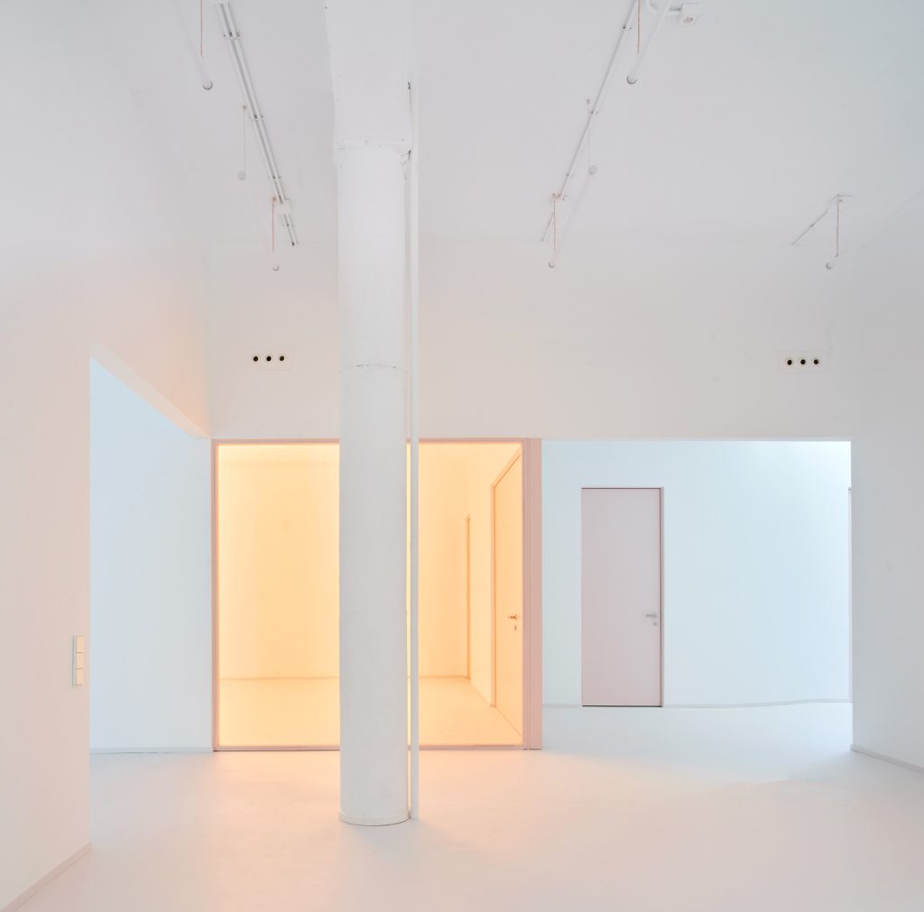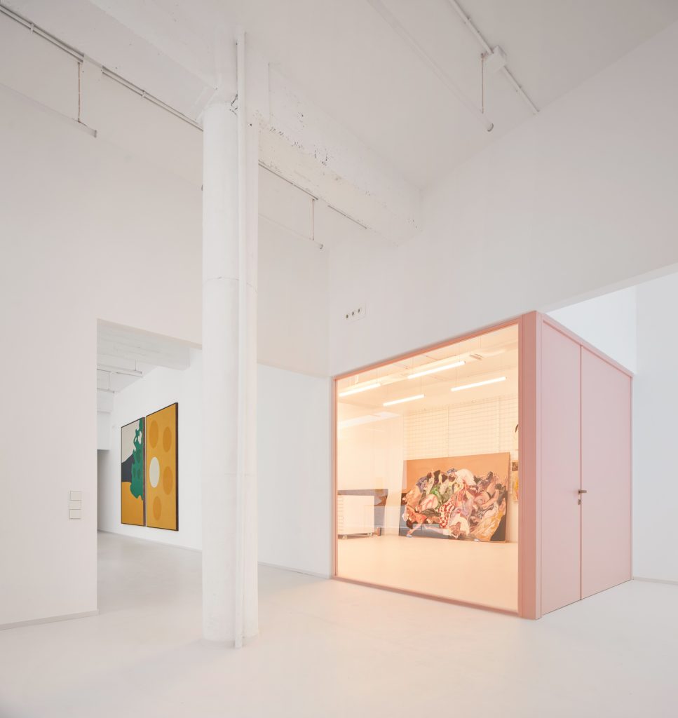 The interior is defined by a controlled material palette that operates less as expression than as modulation. White surfaces establish a field of neutrality, amplifying light and reducing distraction. Grey flooring introduces weight and continuity underfoot. Pink frames trace a graphic rhythm across the space, while light blue furnishings register as soft interruptions within an otherwise restrained composition.