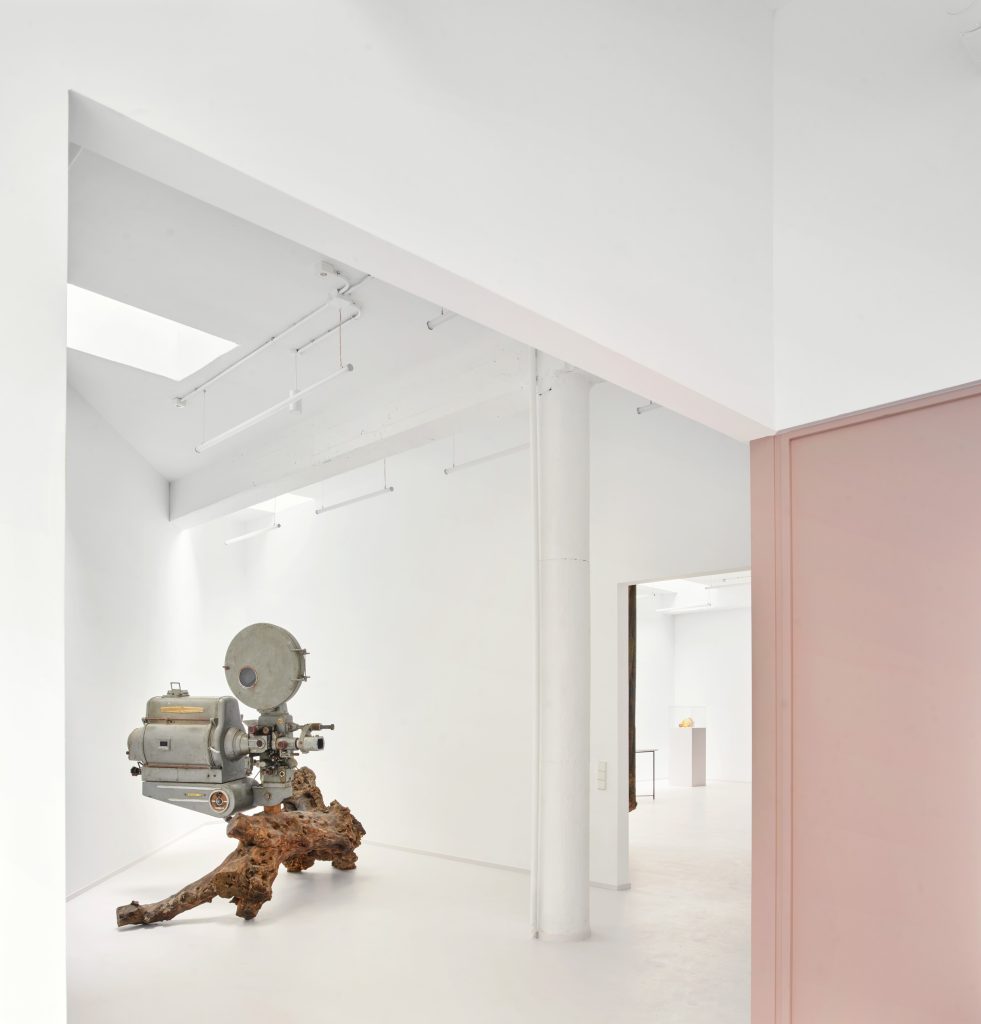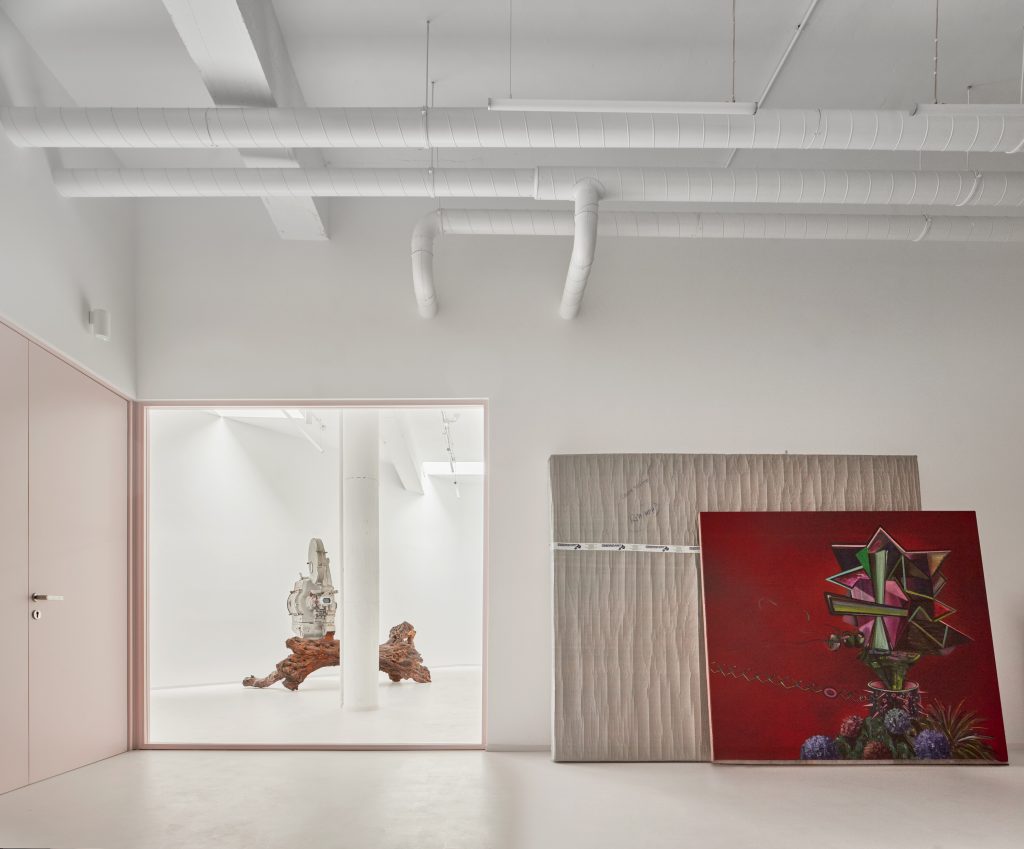 The 600 square metre interior refuses the conventional segmentation of functions. Exhibition spaces unfold alongside storage, kitchen, dining, and workspace without hierarchy, forming a continuous field in which each element remains visible and implicated in the whole.
