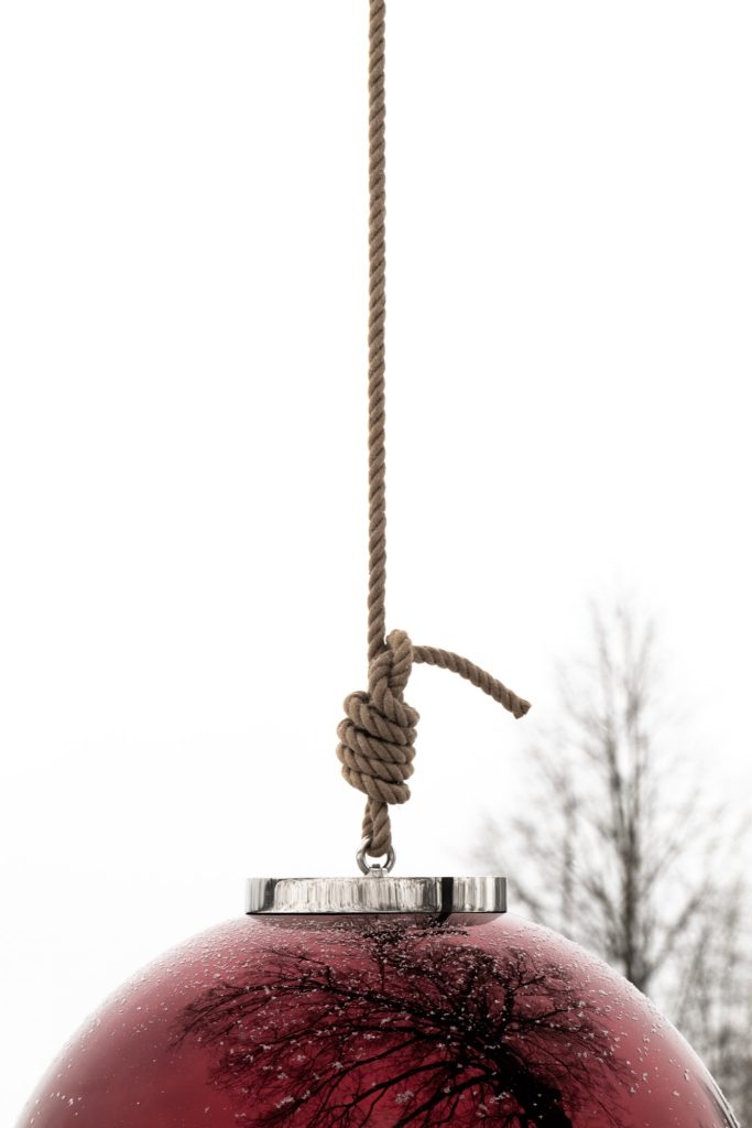 The sphere is suspended from a barren tree by a hemp rope, held between ground and sky in a state that resists resolution. It neither falls nor settles. What emerges is not equilibrium but a prolonged negotiation with gravity itself. The object does not overcome force. It endures it.